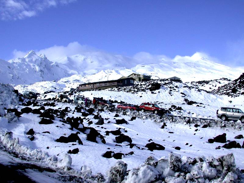 新西兰北岛最著名的滑雪胜地Mt Ruapehu.这是在山下的停车场照的。看上去有点乱。 图片如下: