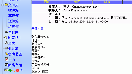 我按照下面的步骤做了在DW中的反馈表单(EMAIL发送),但是最后一点不明白,(“反馈表单在使用Outlook Express的电脑上,使用email方式发送,接收到的是一些文本”。),所以就不成功,请高手帮忙帮忙!! 拜托! 操作的步骤: 1.将插入点放在希望表单出现的位置。选择“插入”>“表单”,或选择“插入”栏上的“表单”类别,然后单击“表单”图标。 2.将插入点放在红色的表单中,单击“插入”栏“常用”类别中的“表格”按钮。
