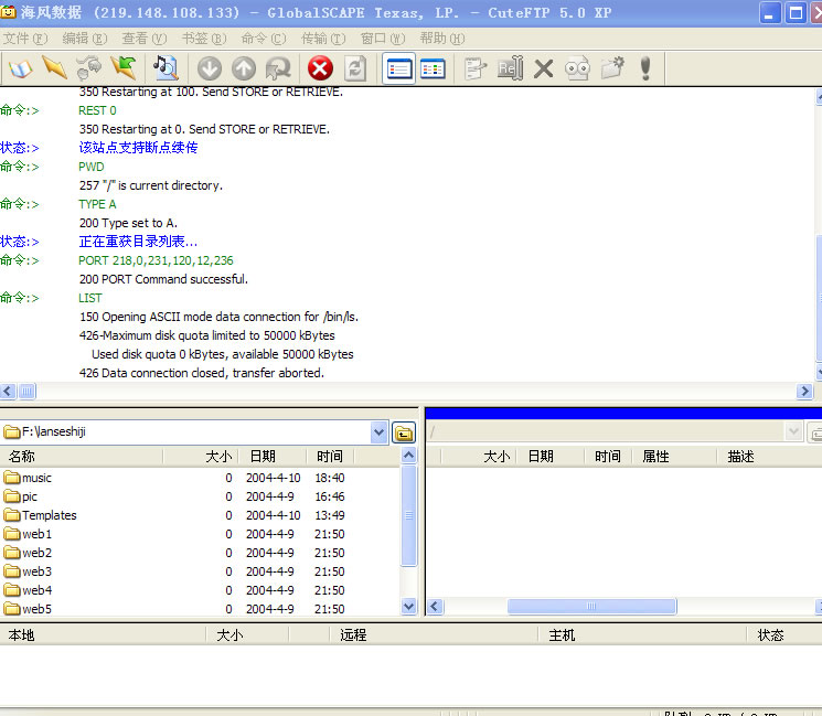 用dreamweaver自带的上传,这样添过表格之后 点击上传就弹出来无法与远程服务器联系 用cuteftp 5.0 设置过后就出现这样的情况 点击上传之后就什么反映都没有了!!! 图片如下:  图片如下: