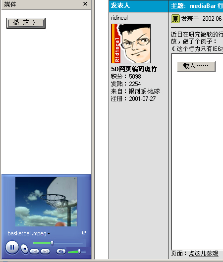 代码很简单: 原窗口: 媒体窗口: onclick="divMedia.playURL('http://www.5dmedia.com/users/ridincal/basketball.mpeg', 'video/mpeg');" value="播 放 〉"/>