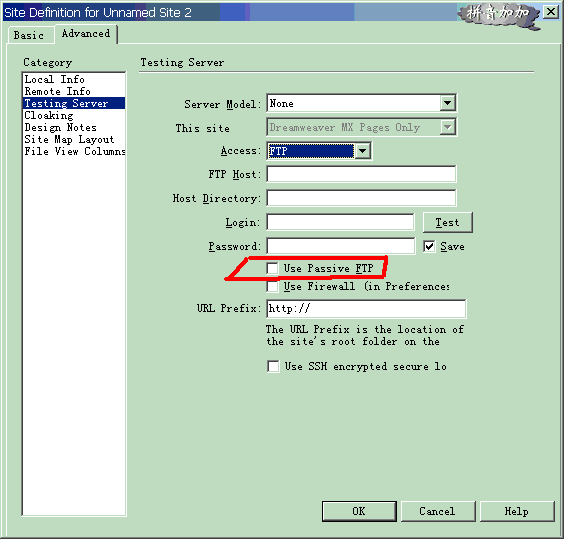 那位高手知道dreamweaver Mx 定义站点时的use passive FTP功能在哪里?我的ftp只能通过此项才能链接。该版本是把该功能删除了吗?