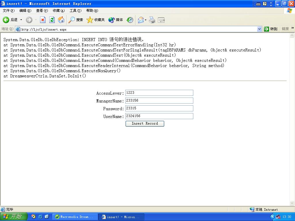 大家好,又有麻烦请大家帮忙: ASP.NET C#在DreamweaverMX中的插入数据时出现如图所示的问题,不知什么原因? 图片如下:  谢谢各位高手!!! 源码如下: <%@ Page Language="C#" ContentType="text/html" ResponseEncoding="gb2312" %> <%@ Register TagPrefix="MM" Namespace="DreamweaverCtrls" Assembly="DreamweaverCtrls,version=1.0.0.0,publicKeyToken=836f606ede05d46a,culture=neutral" %> runat="server" CommandText='<%# "INSERT INTO Manager (AccessLever, ManagerName, Password, UserName) valueS (?, ?, ?, ?)" %>' ConnectionString='<%# System.Configuration.ConfigurationSettings.AppSettings["MM_CONNECTION_STRING_myConnection"] %>' DatabaseType='<%# System.Configuration.ConfigurationSettings.AppSettings["MM_CONNECTION_DATABASETYPE_myConnection"] %>' Expression='<%# Request.Form["MM_insert"] == "insert" %>' CreateDataSet="false" SuccessURL='<%# "default.aspx" %>' FailureURL='<%# "false.htm" %>' Debug="true" > 0)) ? Request.Form["AccessLever"] : "" %>' Type="WChar" /> 0)) ? Request.Form["ManagerName"] : "" %>' Type="WChar" /> 0)) ? Request.Form["Password"] : "" %>' Type="WChar" /> 0)) ? Request.Form["UserName"] : "" %>' Type="WChar" />