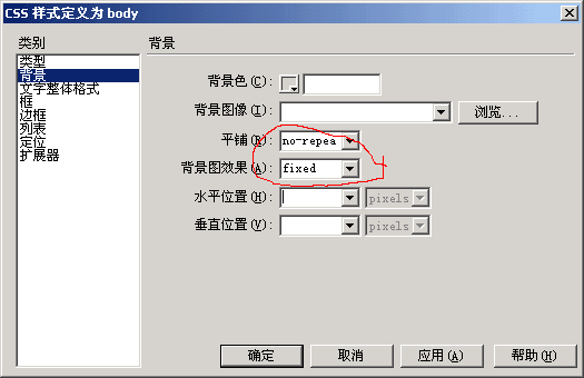 你可以利用DW的CSS编辑设定!编辑标签body设定背景项! 图片如下: