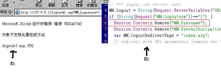我设置的是当单击“退出系统”这几个字时系统会回到首页。但是当我测试时点了后出现了图1,上面说什么行6有问题,我找到了行6图2。但不知错在什么地方请指教。