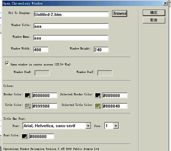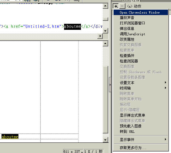 图片如下:  图片如下:  图片如下:  图片如下: www.5dmedia.com/bbs/uploadFiles/20028192325578418.gif我看了“ridincal 关于无边窗口插件的使用”的贴子,我也安装了chromelessWinRed.mxp插件,虽然觉得ridincal讲述了关键的制作步骤,可我看了后还是一知半解!(图1) 我做这个首先是要新建一个网页并保存,然后创建一个连接,选择刚才保存的那个网页,再在行为中选“open chromeless windows”,出现下面一些选项(图2) 预览时,只要把鼠标移到(还没有点击)那个超连接上便会自动打开无边窗口;如果把onMouseOver改为onclick 的话,点击那个超连接是会弹出无边窗口可原来的网页会不见掉 还有几个问题就是怎么去掉无边窗口这些滚动栏;无边窗口中的内容要怎么编辑,比如图片和动画。 是不是还有什么好用插件制作无边窗口啊???