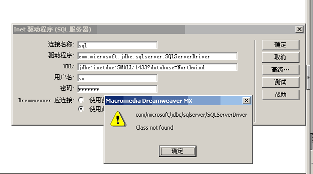 在Dreamweaver MX中用jsp怎么连接access或者sql的数据库啊?我已经安装了j2sdk还有tomcat,而且tomcat运行正常,浏览器中输入http://local:8080可以正常显示。在Dreamweaver MX中创建一jsp的站点,连接sql数据库的时候,在驱动程序一栏填入com.microsoft.jdbc.sqlserver.SQLServerDriver,然后总是报错com/microsoft/jdbc/sqlserver/SQLServerDriver class not found。连接access数据库的时候就报错“出现一个不知名的错误”…………