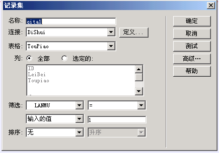 由于我不太会各种脚本语言,所以我充分挖掘DWMX的功能,制作出一个简单的投票系统。高手看到不要笑我,如果你不输入代码不一定能做出我这样的投票系统。 1、首先建一个表很简单了,字段为ID(自动编号)、LANMU(文本)、TOPU(备注),另外建一个图片只有1像素宽12像素高toupiao.gif 2、建投票页面 图片如下:  。把单选按钮的选定值分别设为1、2、3,另外还有一个隐藏区域将其默认值设为图片的引入“IMG SRC=......”(如图) 图片如下:  建插入记录,将单选“radiobutton”插入LANMU字段,将隐藏区域“hiddenField”插入TOPU字段。 3、建立查看界面。添加四个记录集,添加时筛选分别为输入的值=1、和=2、和=3、无 图片如下:  然后分别将三个记录集的TOPU插入页面,并选中他建立重复区域,选好记录集,显示所有记录。 图片如下:  其他的不用说了吧。 当然在数据里在建一个表并建立修改得页面就可以更改投票的项目了。那是后话了。。。