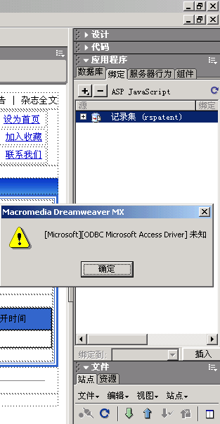 当我点击绑定里的记录集时,它就会跳出下面的提示框,我也重新建立过数据库链接.也不好使,但我打开别的网页,同样点击这个里面的记录击确是好使,现在我也不明白是什么问题造成这样的.望高手指点!