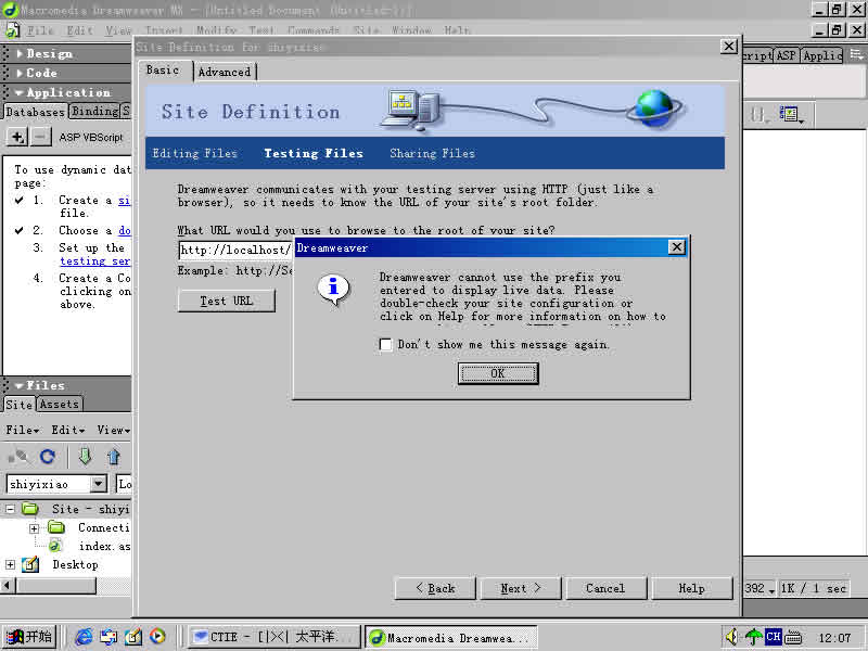 我在设置动态网页的测试服务器时遇到如图的难题,我已经反复检查了N遍了,每部都是按照教材设置的,请快帮帮我吧,谢谢!!!! 图片如下: