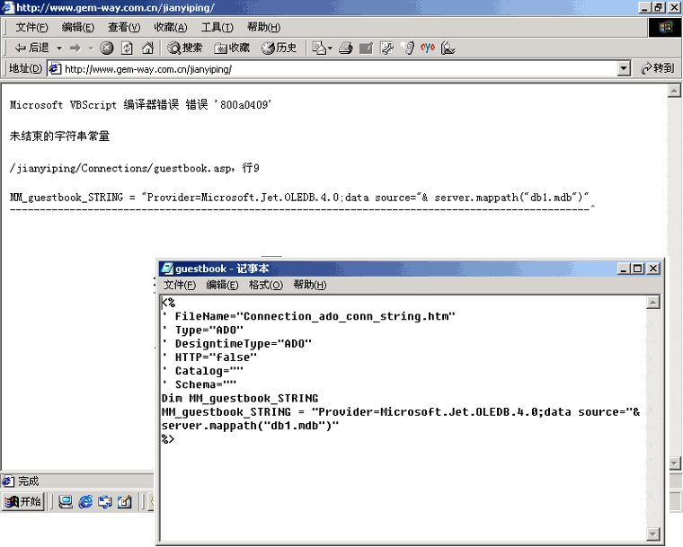 我的connection里的guest.asp如下的记事本上传后IE显示如下,请问那里出错了,应改成怎样? 图片如下: