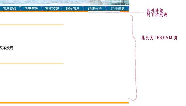 导航是下拉的级联菜单,中间是用ASP编写的(IFREAD)语句。在页面调另一个页面。。