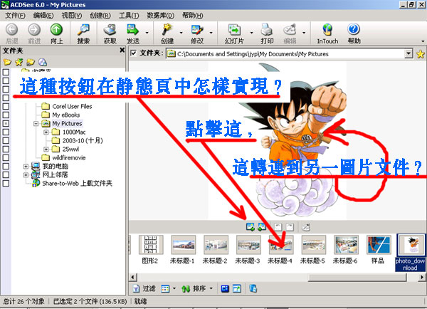 像仿做一个ACDsee,请各位帮帮忙请教两个问题: 1、如何在DW中做“向前”、“向后”、“顺时针转90度”这几个按钮?(象ACDsee的那样,同一个文件夹下的图片,按“向前”、“向后”按钮就能浏览图片) 2、如何做一个连接,使图片进行替换? 图片如下: