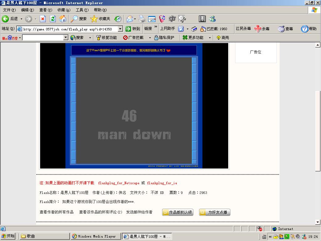 是男人就下 100层! 左右方向键控制小人移动! 据说 如果这个游戏你到了100层会出现作者的***. game.0577job.com/flash_play.asp?id=14350我最高只玩到了 31层。。。看看大家怎么样~~~~支持的顶一下~~~~