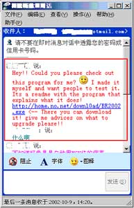 4、其中home.no.net/downl0ad/BR2002.exe 以超链接的方式发送,收到该信息的用户不小心点击这个链接执行了这个蠕虫的话,蠕虫就会继续通过MSN Messager向其他联系人发送同样的信息,引起连锁反应,造成病毒的快速传播。
